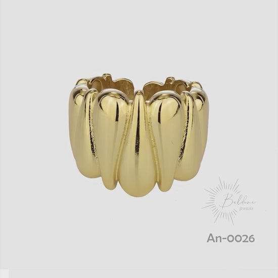 Una flor de color oro que abraza tu mano: este anillo cuff statement en chapa de color oro premium es una escultura audaz formada por pétalos grandes, redondeados y voluminosos que se curvan y superponen creando relieve tridimensional, movimiento y un efecto orgánico lleno de glamour.